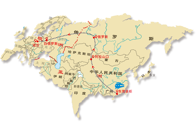 路線:深圳裝柜→成都/重慶→阿拉山口→ 哈薩克斯坦→ 俄羅斯→ 白俄羅斯→ 波蘭→英國(guó)